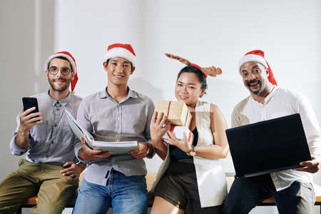 Positive multi-ethnic business team in Santa hats posing with smartphone, computer, documents folder and holiday gifts