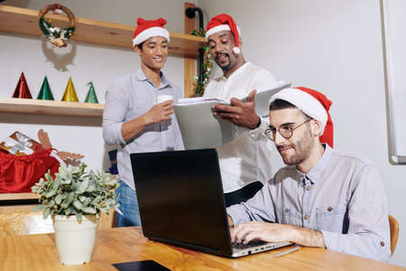 Young man in Santa Claus hat working on laptop in office when his colleagues discussing documents in folder