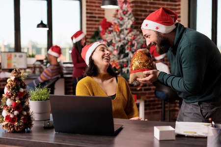 Businessman giving present box to woman in office, celebrating christmas eve holiday with gifts. Coworkers feeling happy about festive season with xmas ornaments and decorations.
