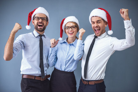 Happy business people in Santa hats are looking at camera and smiling while celebrating New Year, on gray background