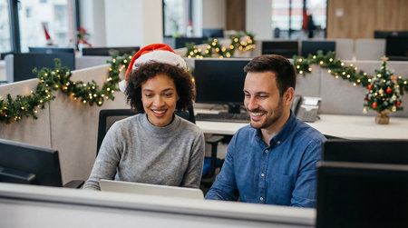 Smiling man and woman in Santa hats looking at each other while sitting at computer desk in office