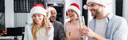 Smiling multicultural businesspeople in santa hats holding glasses of champagne in office, banner