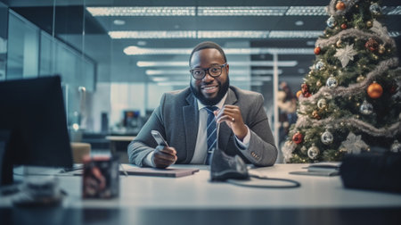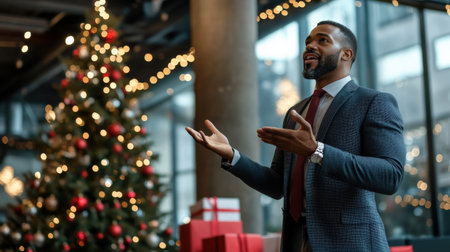 A black man CEO giving a Christmas speech to employees during a company holiday party, with a tree and gifts in the background