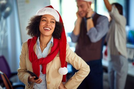 Office people celebrating winter holidays together at work.Happy business people in santa hat.