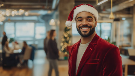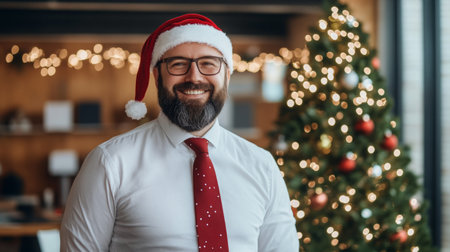 Cheerful man in festive attire celebrates Christmas in a cozy decorated office setting