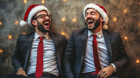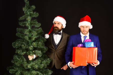 Two business men in Santa Claus hats celebrating Christmas on gray background.