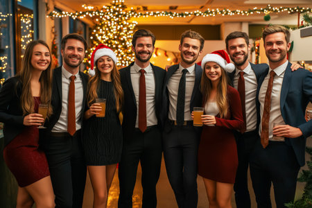 Group portrait of cheerful colleagues at a festive Christmas party, standing together and smiling