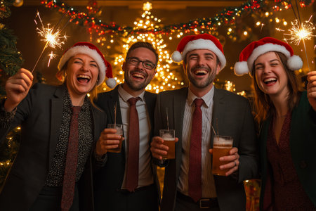 Cheerful friends celebrating Christmas with festive hats and glasses