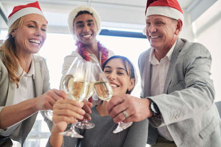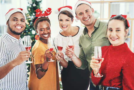 We wish everyone a joyful and merry Christmas. Portrait of a group of creative businesspeople drinking champagne and celebrating together at their office Christmas party.