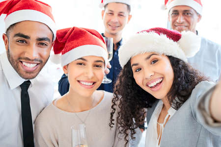 Christmas time brings us all together. Shot of a group of businesspeople taking a selfie at work.