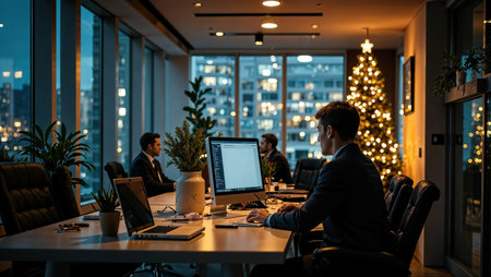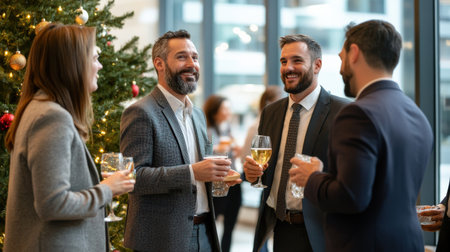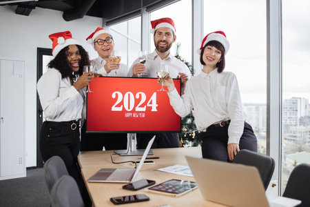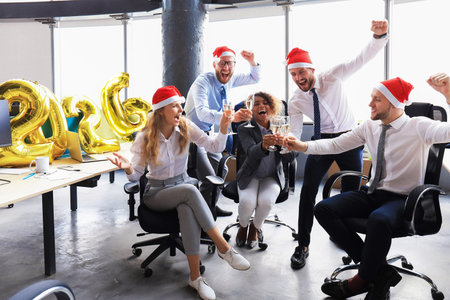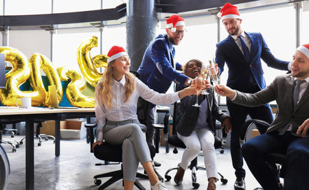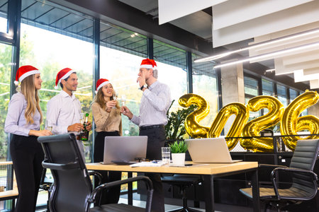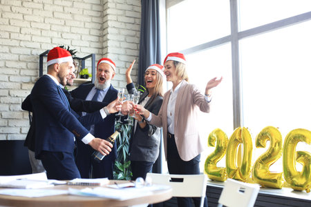 Business people are celebrating holiday in modern office drinking champagne and having fun in coworking. Merry Christmas and Happy New Year 2026.