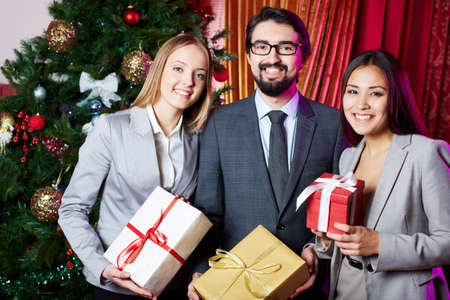 Portrait of joyful colleagues with giftboxes looking at camera with xmas tree on background