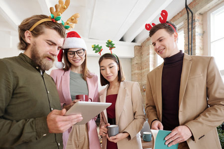Group of young contemporary friendly office managers looking at tablet display