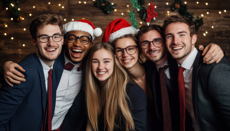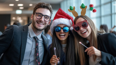 A diverse business holiday party photo booth with festive props and coworkers having fun