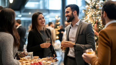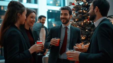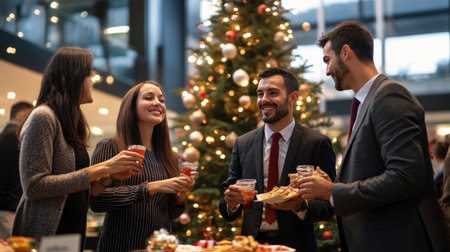 A business holiday party with coworkers enjoying snacks and drinks around a Christmas tree