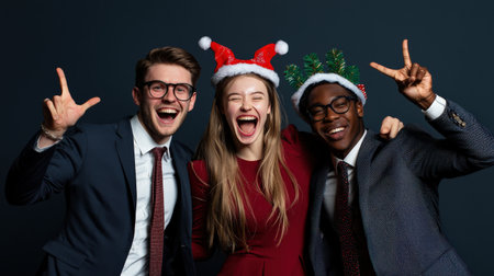 Portrait of a group of young business people celebrating Christmas isolated over dark background