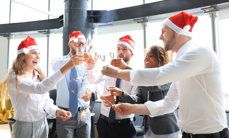 Business people are celebrating holiday in modern office drinking champagne and having fun in coworking. Merry Christmas and Happy New Year 2020.