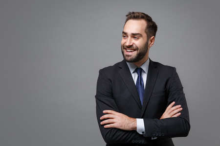 Smiling young business man in classic black suit shirt tie posing isolated on grey background. Achievement career wealth business concept. Mock up copy space. Holding hands crossed, looking aside.