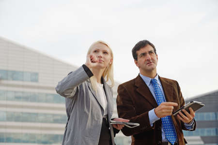 Businessman and businesswoman outdoors, holding digital tablets, looking lost
