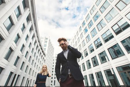 Businessman and businesswomen. Beautiful young business woman and handsome businessman in formal suits are using a laptop standing outdoor.
