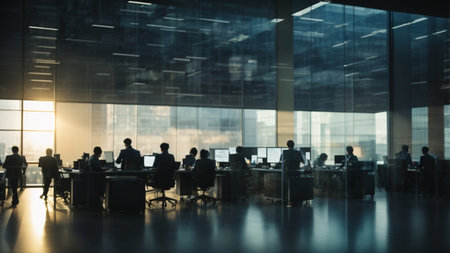 A group of professionals works in a bright, contemporary office setting. Natural sunlight illuminates the scene, highlighting the modern decor and diverse team engaged in various tasks. The composition features individuals at desks and collaborating, suggesting a collaborative and productive atmosphere. Suitable for commercial or editorial applications related to business.