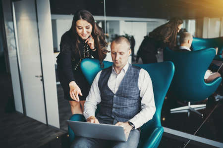 A business couple: a man entrepreneur on a teal armchair is sharing the screen of his laptop with his female colleague, a hispanic businesswoman who is standing near him and pointing on the screen