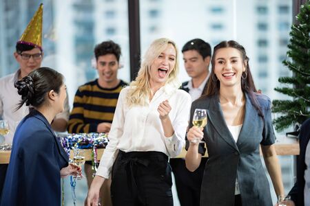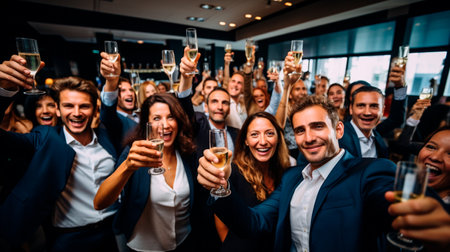 Close-up view of business team of multinational employees holding clinking glasses of champagne and smiling cheerfully at corporate New Year or Happy Christmas eve.