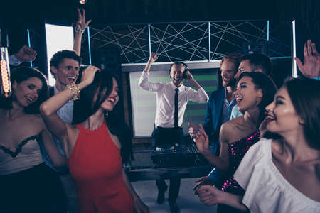 Listen favorite singer band concert. Millennial charming people free time enjoy noise loud cheerful exciteemnt indoors wear dress suit lights