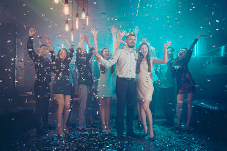 Full length body size photo of cheerful charming beautiful young people having fun at night club dancing in falling confetti rain standing under lights
