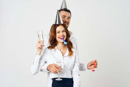 Cheerful young couple smile celebration champagne emotion model