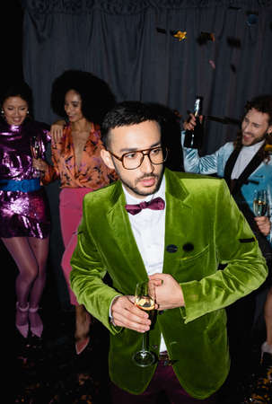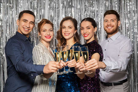 Happy multi ethnic friends celebrating new year's eve, toasting with champagne flutes at a glamorous party