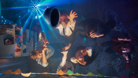 Group of happy people in formalwear dancing and having fun together with confetti flying all around