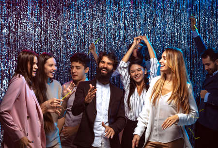 Group of cheerful young people have party and celebrating new year indoors.