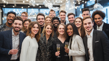 Happy smiling people have fun at a New Year's Eve party. Generative AI.