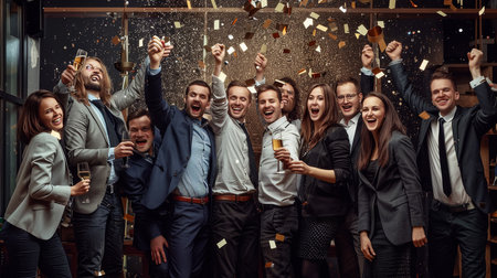 Happy diverse employees team celebrating success business achievement among confetti