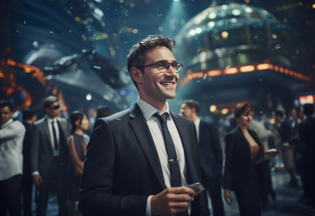 Portrait of a young businessman with business team in modern conference hall with glasses of champagne.