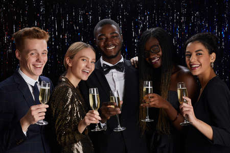 Waist up portrait of multi-ethnic group of friends smiling happily while enjoying elegant party