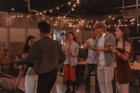 Young Asian group man and women dancing new year christmas party in midnight december at nightclub countdown luxury