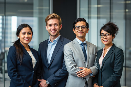 Four diverse professionals in formal wear standing together, likely colleagues or business partners, in a modern office setting with glass walls.
