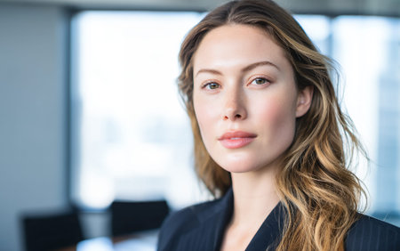 A poised blonde woman with flowing waves exudes leadership in a modern office environment, dressed professionally, with a bright, empowering atmosphere