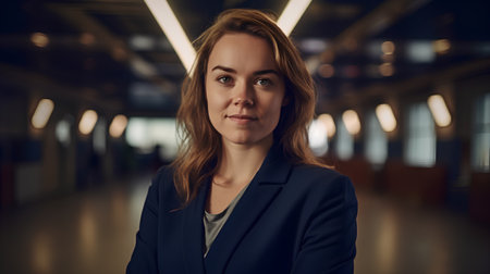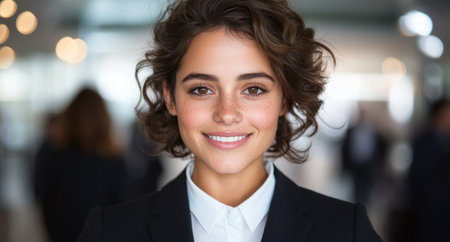 A woman with wavy hair stands confidently in a sleek airport terminal, dressed in a stylish blazer. She smiles warmly at the camera, radiating professionalism and approachability.