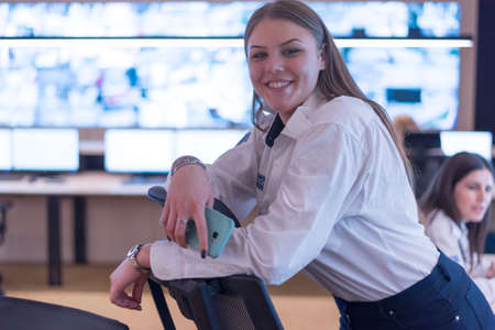 Security guard monitoring modern CCTV cameras in surveillance room. Female security guard in surveillance room. Smiling into camera.