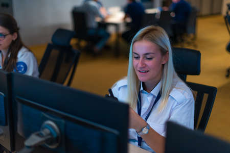 Female security operator working in a data system control room offices Technical Operator Working at workstation with multiple displays, security guard working on multiple monitors