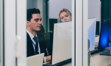 Security guard monitoring modern CCTV cameras in a surveillance room. Group of security guards sitting and monitoring.