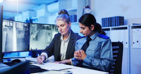 Security guard monitoring modern CCTV cameras in a surveillance room. Female security guards sitting having conversation monitoring cctv.