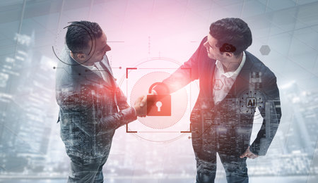 Two handsome businessman in suits thinking about career opportunities at cybersecurity compliance division to protect clients confidential information. IT lock icons over Bangkok background.