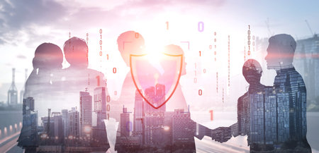 Diverse business team working together in city with double exposure of blurry cyber security interface. Concept of data protection. Toned image