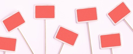 Group of vintage chalkboards or signbaords living coral color with copy space in wooden frame isolated on white background, flat lay