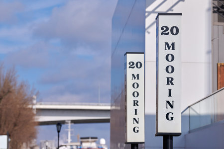 Mooring pier signs in city embankment, identification signs with MOORING inscription for arriving tourist ships. Mooring signs on street post for docked ships, blue sky background