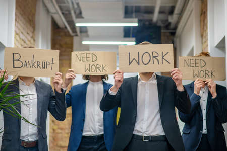 Real life. Men with raised posters demanding work are standing in office, faces are not visible